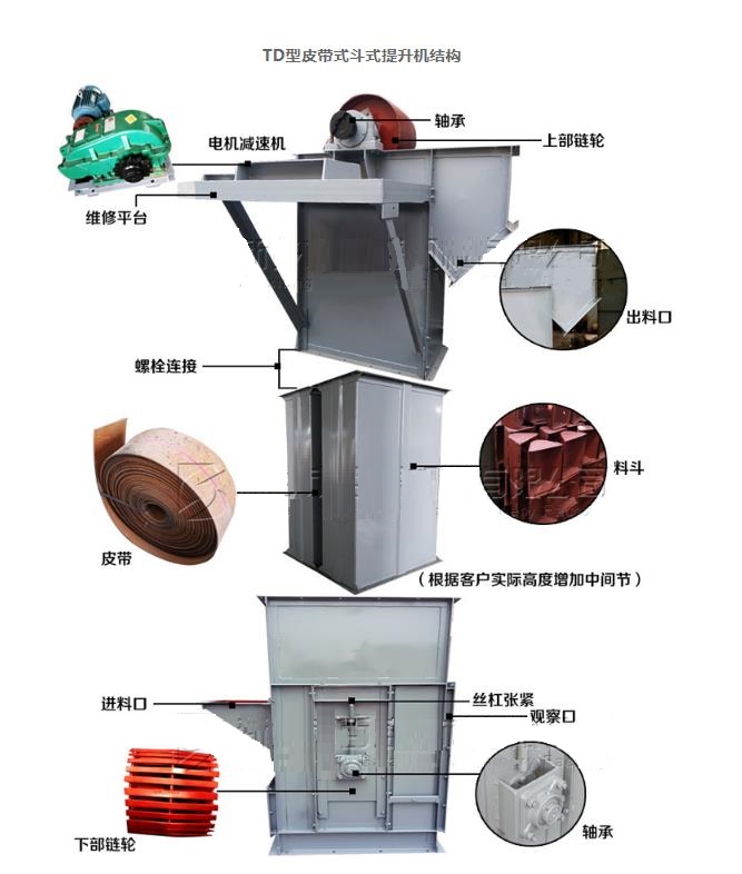 TD型斗式提升機(jī)由運(yùn)行部分(料斗與牽引膠帶),帶有傳動(dòng)滾筒的上部區(qū)段、帶有拉緊滾筒的下部區(qū)段、中間機(jī)殼、驅(qū)動(dòng)裝置、逆止制動(dòng)裝置等組成。適用于向上輸送松散密度ρ<1.5t/m3粉狀、粒狀和小塊狀的無磨琢性和半磨琢性散狀物料,如煤、砂、焦末、水泥、碎礦石等。另一種鋼絲繩芯膠帶斗式提升機(jī),由于它的牽引構(gòu)件為鋼絲繩芯膠帶所以比TD型的橡膠帶具有更好的耐磨抗拉效果。