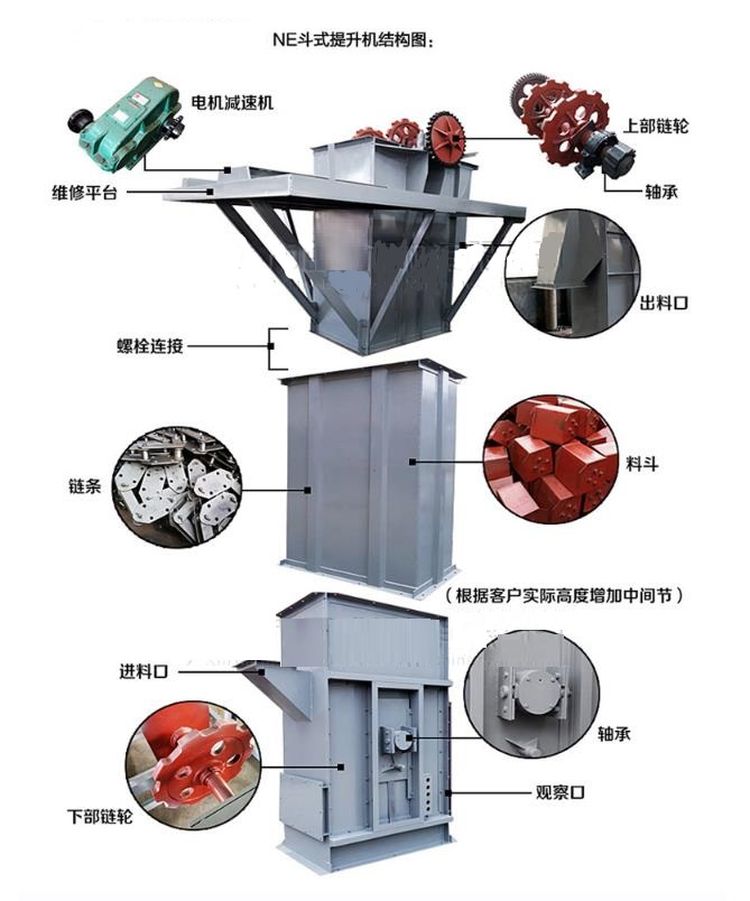 NE系列板鏈斗式提升機(jī)由運(yùn)行部件、驅(qū)動(dòng)裝置、上部裝置、中部機(jī)殼、下部裝置組成。