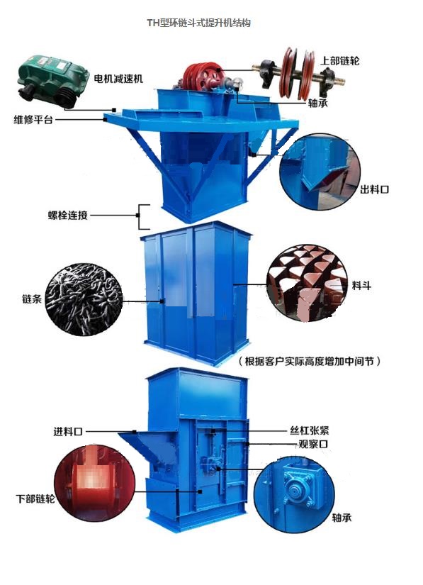 TH系列圓環(huán)鏈斗式提升機(jī)適用于輸送粉狀、粒狀及小塊狀的無磨琢及磨琢性小的物料。TH型環(huán)鏈?zhǔn)蕉肥教嵘龣C(jī)是一種圓環(huán)鏈斗式提升機(jī)采用混合式或重力卸料,挖取式裝料。TH型環(huán)鏈?zhǔn)蕉肥教嵘龣C(jī)適用于輸送堆積密度小于1.5t/m3易于掏取的粉狀、粒狀、小塊狀的底磨琢性物料。如煤、水泥、碎石、砂子、化肥、糧食等。TH型斗式提升機(jī)用于各種散狀物料的垂直輸送。適用于輸送粉狀、粒狀、小塊狀物料,物料溫度在250℃以下。