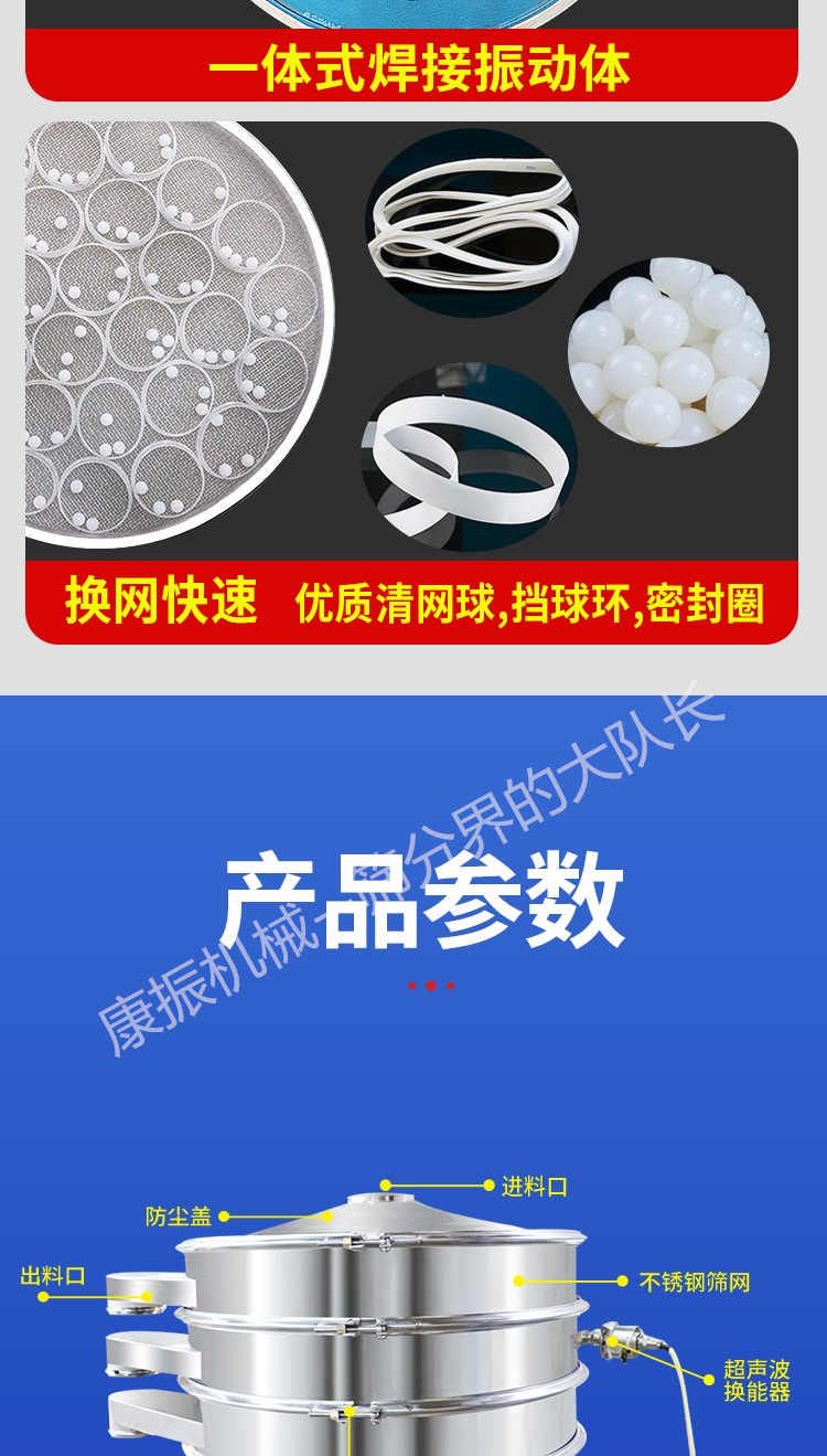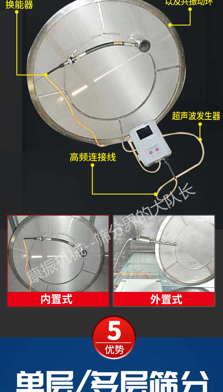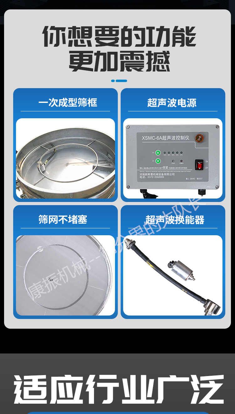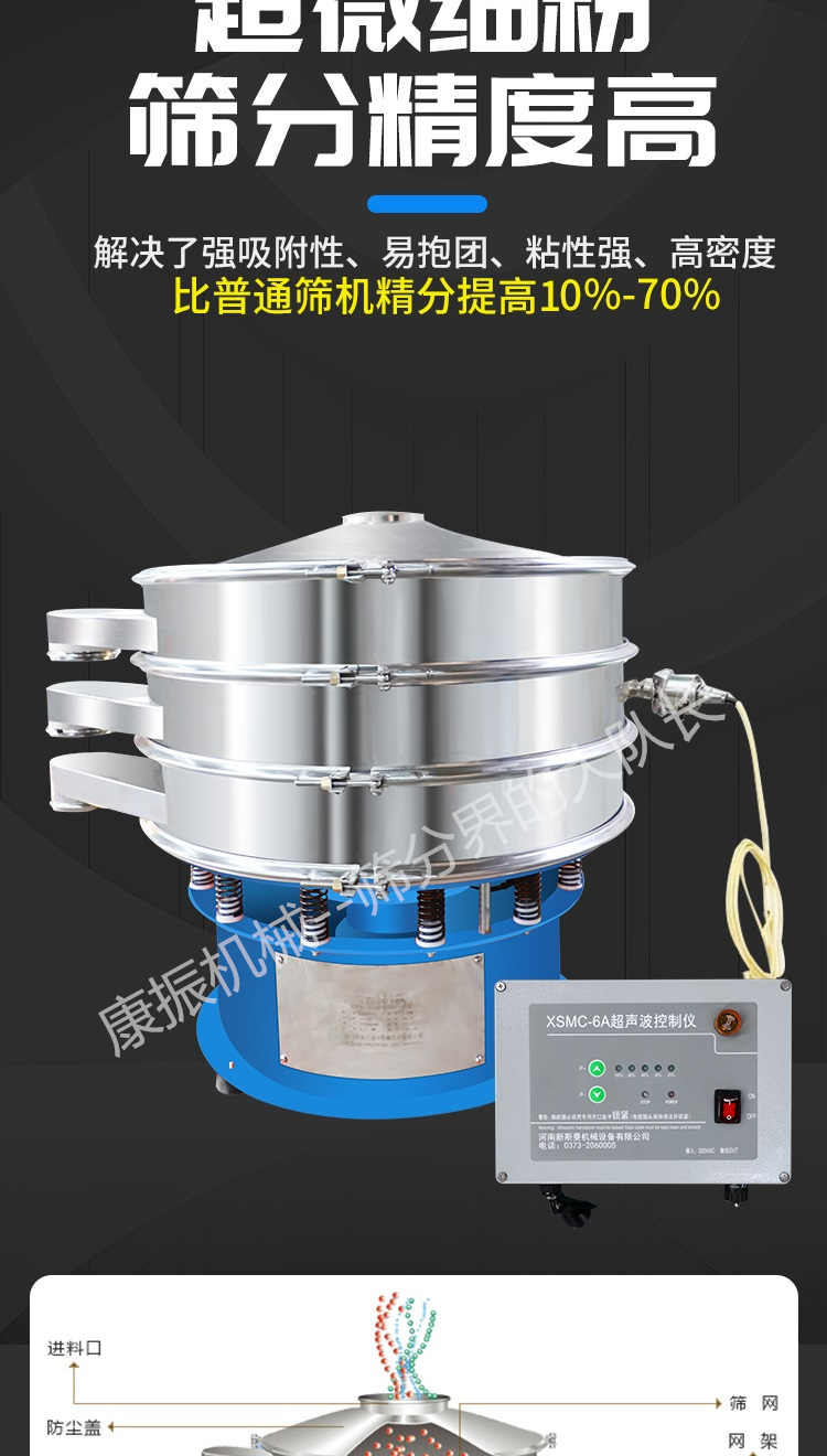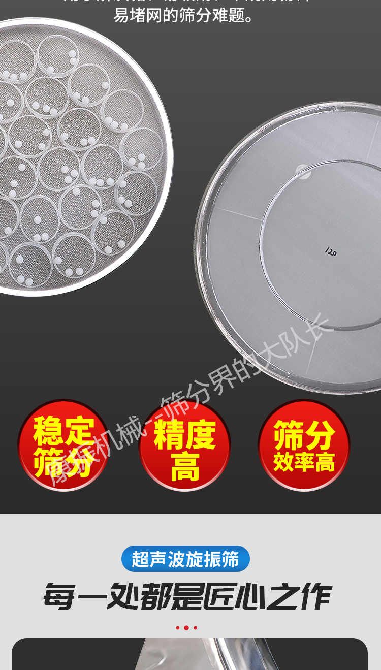 超聲波振動篩是在旋振篩的基礎上引入了超聲波清網(wǎng)裝置,通過將220V、50Hz或110V、60Hz電能轉化為18KHz的高頻電能,輸入超聲換能器,將其變成18KHz機械振動,從而達到高篩分和迅速清網(wǎng)的目的,使超微細粉篩分成為易事。該系統(tǒng)在傳統(tǒng)的振動篩基礎上在篩網(wǎng)上引入一個低振幅、高頻率的超聲振動波(機械波),以改善超微細粉體的篩分性能。特別適合高附加值精細粉體的用戶使用。超聲波篩分系統(tǒng)是一種簡單實用、可靠的篩分系統(tǒng),是當前網(wǎng)孔堵塞的有效的解決方法??蓮V泛應用于制藥、冶金、化工、選礦、食品等要求精細篩分過濾的行業(yè),篩分過濾精度高,有效解決因團聚、靜電、強吸附性卡堵網(wǎng)孔等篩分難題,是國內(nèi)篩分行業(yè)的一項重大技術突破。