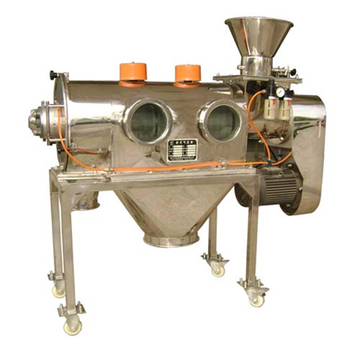 臥式氣流篩篩網(wǎng)為圓筒狀,置于機體內(nèi),物料通過螺旋輸送系統(tǒng)后,和氣流混合、霧化進入網(wǎng)筒內(nèi);
