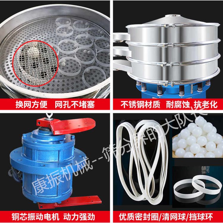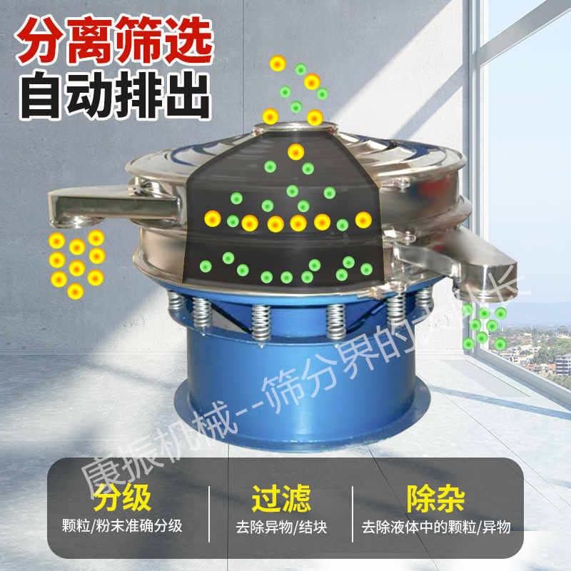 任何顆粒、粉末、粘液一定范圍內(nèi)均可篩選。篩分細(xì)至500目或0.028mm, 過濾小可至5微米。分級篩選,可篩一至五層篩網(wǎng),能同時(shí)進(jìn)行二至六個(gè)等級的分選或過濾。